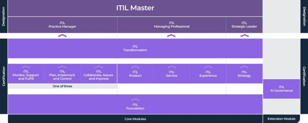 - Pour ceux qui souhaitent obtenir la nouvelle certification ITIL®5 : Un examen ITIL Foundation Bridge (version 5) de 30 minutes est disponible pour une mise à jour rapide vers la dernière version.