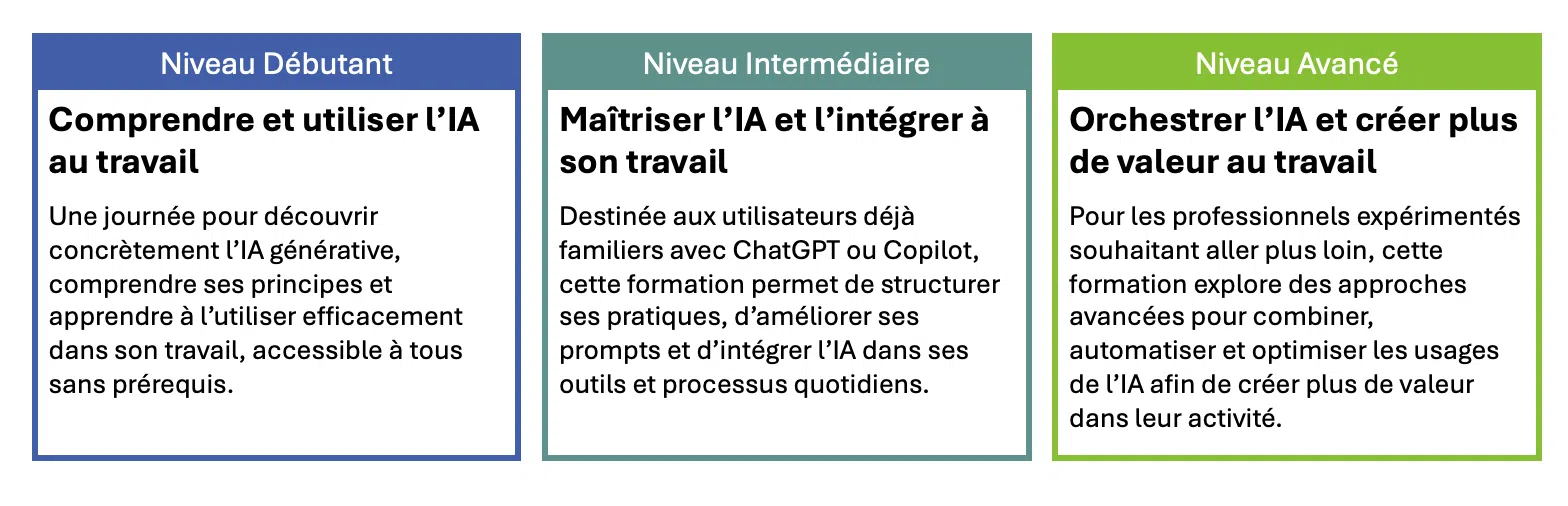 - Orchestrer l’IA et créer plus de valeur au travail (Niveau Avancé) : Automatiser, orchestrer et transformer l’IA en levier de performance.
